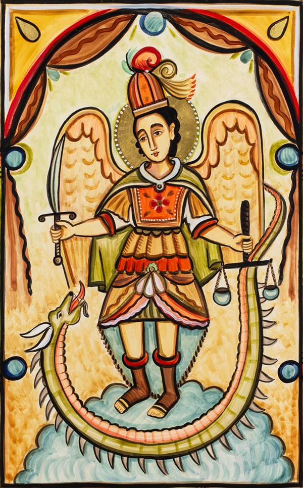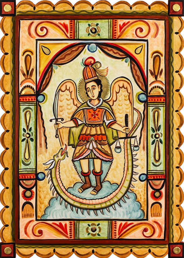 Retablo: Natural Pigments, Pine, Natural Gesso, 23K gold leaf, 42”h x 29”w x 2”d, Item No. 23439,