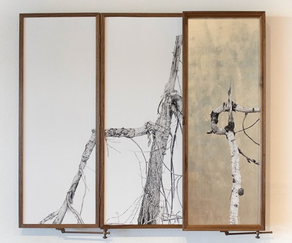 Ink painting on panel, gold leaf, walnut, 50"H x 76"W, Item No. 23349,